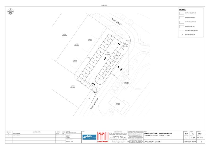 Lot 74 DP755928 is a vacant lot at the end of Frank Lewis Way on the western side held by the State of New South Wales gazetted for Parking in 2006 and for Public Recreation, Community Purposes, Environmental Protection, Tourist Facilities & Services in 2008. The 2016 master plan showed the development of a “new car park 32 spaces”; however, the detail design undertaken to date allows for 26 spaces for single vehicles. Refer Attachment 3 Option 1.