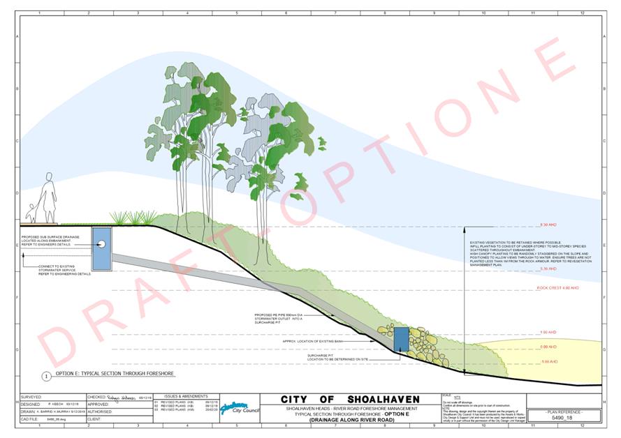 Recommendation (Item to be determined under delegated authority) That Council adopt Option E - Drainage of the area between Renown Avenue and Mathews Street (opposite the Heads Hotel) along River Rd discharging below the slope at a point 30m south of the stairs at Renown Ave (Plan 5490 Rev 03 – sheets 17 to 19) for the Shoalhaven Heads River Road Foreshore Rehabilitation project, and amend the Development Application and Tender Process accordingly.