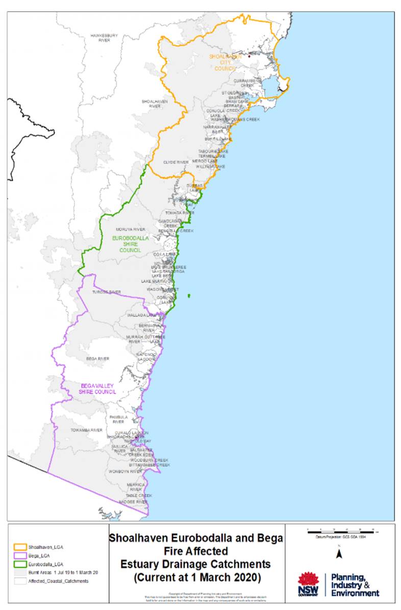 The scale of fires experienced across the Shoalhaven City Council, Eurobodalla Shire Council and Bega Valley Shire Council Local Government Areas burnt a total of over 1 million hectares and impacted approximately 47 estuaries and coastal catchments. Threats to estuaries as a result of fire typically relate to impacts to water quality, bank instability, increased erosion and sedimentation, proliferation of weed species, impacts to riparian corridors and coastal wetlands and terrestrial and aquatic biodiversity.