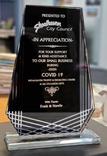 Shoalhaven Trophy & Engraving & All Occasion Gifts, tenants within a Council owned premises located in the Nowra CBD, presented Council with a trophy and letter of appreciation expressing their gratitude for support and assistance given to them by providing rent relief over the COVID19 pandemic.