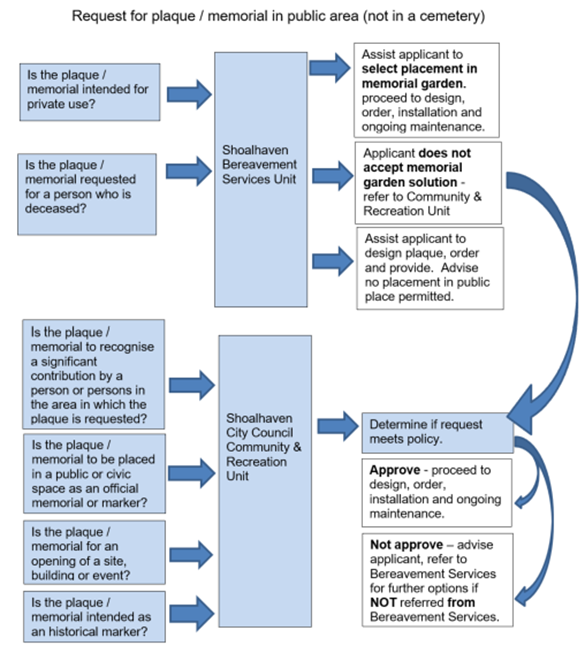 In addition, Council staff from the Community and Recreation Unit and from Bereavement Services Unit have been able to determine a draft process for considering new requests for plaques or memorials in public spaces, as per the suggestions made during the briefing. The draft process is illustrated below and can be adapted based on each individual application received. Initially all request would go to Bereavement Services to assist the applicant with the process.