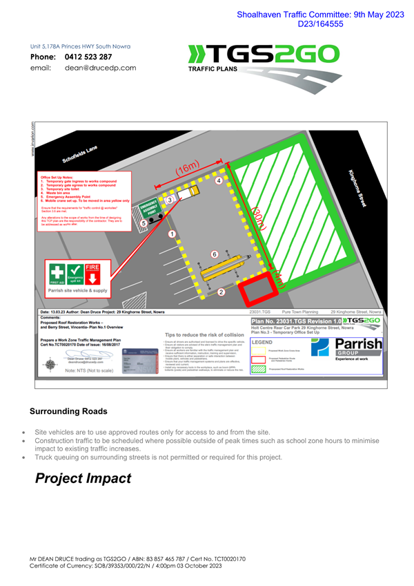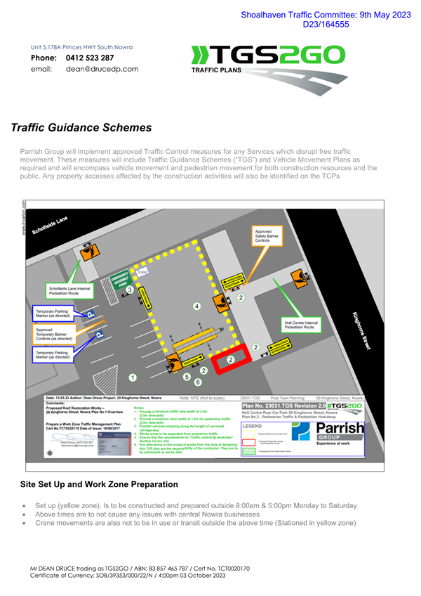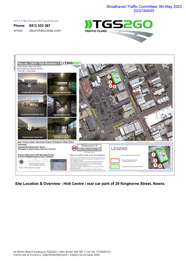 That: 1. The Chief Executive Officer (Director City Services) be advised that the Shoalhaven Traffic Committee has no objection to the temporary use of 12 parking spaces within the Stewart Place carpark, behind 29 Kinghorne Street, Nowra for a period of four (4) weeks during maintenance works to the Holt Centre, as per Document No. D23/164555; subject to the following: a. Payment of associated fees in accordance with Council’s Policy for Private Use of Public Parking POL22/110. b. The provision of a pedestrian ramp to allow wheelchairs / scooters access to the arcade through the Holt Centre; c. The provision of commercial waste services to the Holt Centre, allowing existing commercial front loaded bins to be serviced for the duration of the works; d. The continuation of deliveries to businesses located within and adjacent to the Holt Centre due to the removal of the loading zone for the duration of works. 2. The recommendation be approved by the Director City Services under delegated authority from Shoalhaven City Council - refer MIN21.411 |
