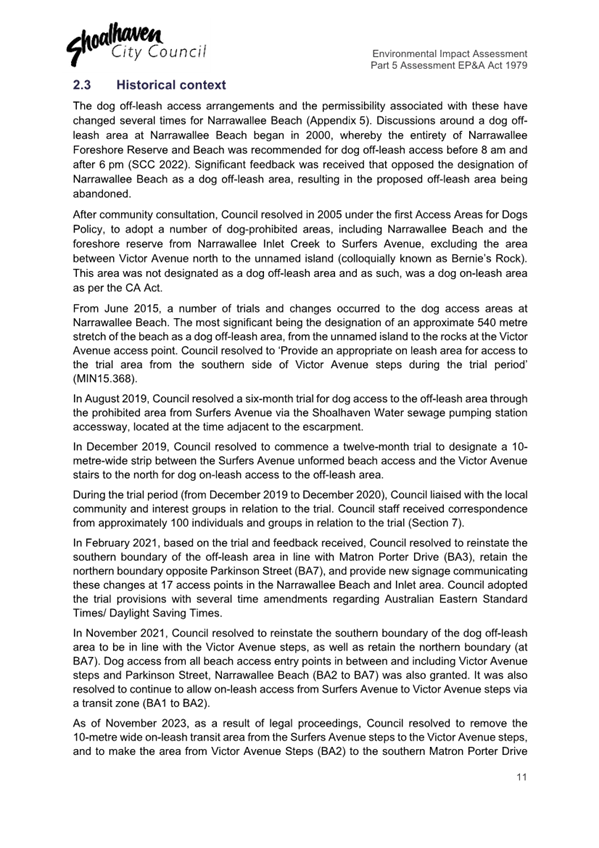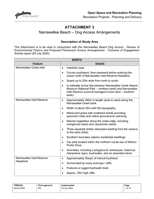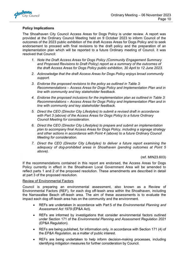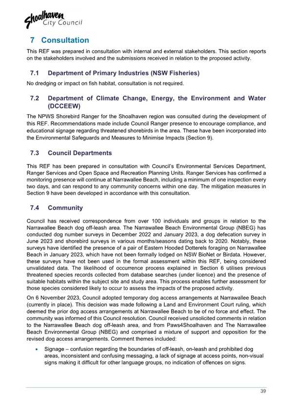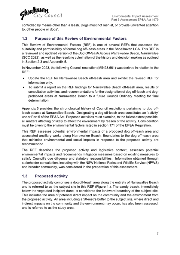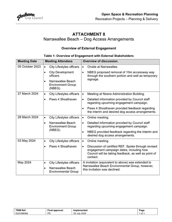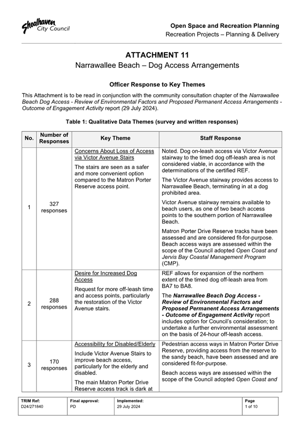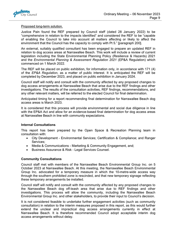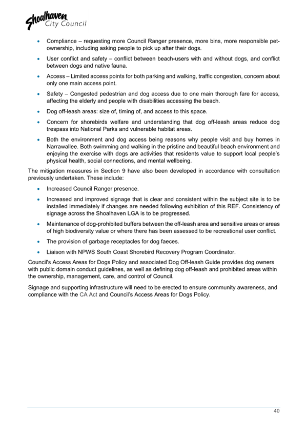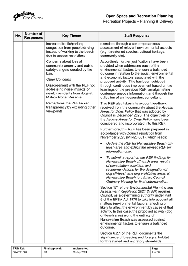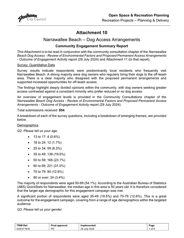 Attachment 1.... Report - Narrawallee Beach Dog Access - Review of Environmental Factors and Proposed Permanent Dog Access Arrangements - Outcome of Engagement Activity (06/11/2023)................. 397