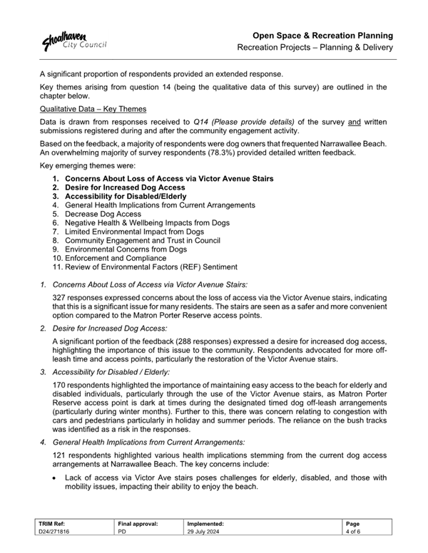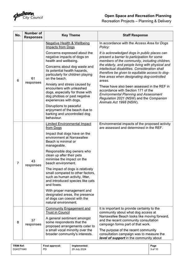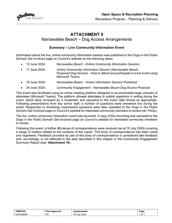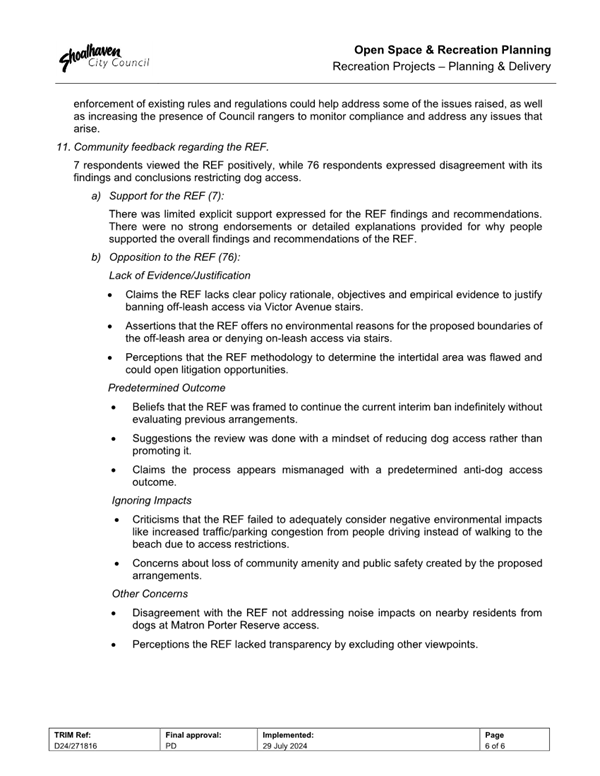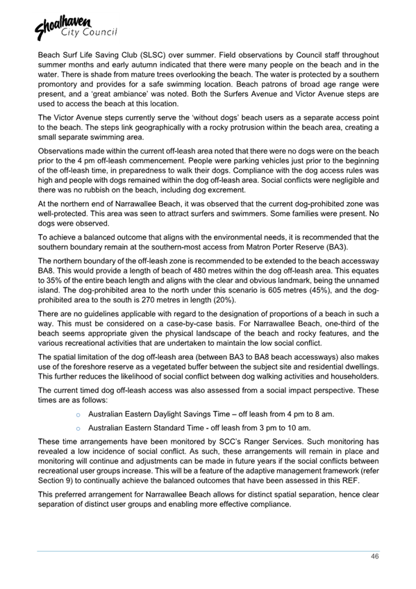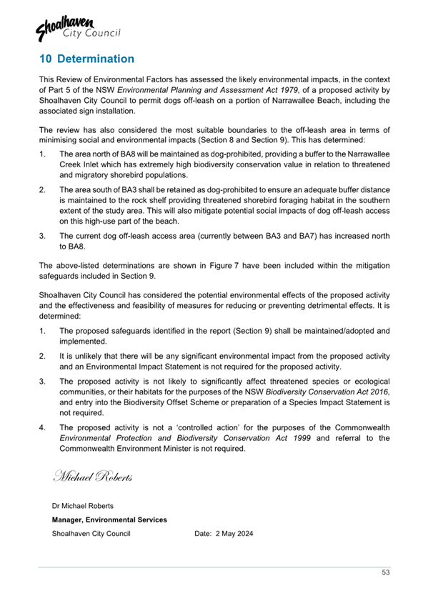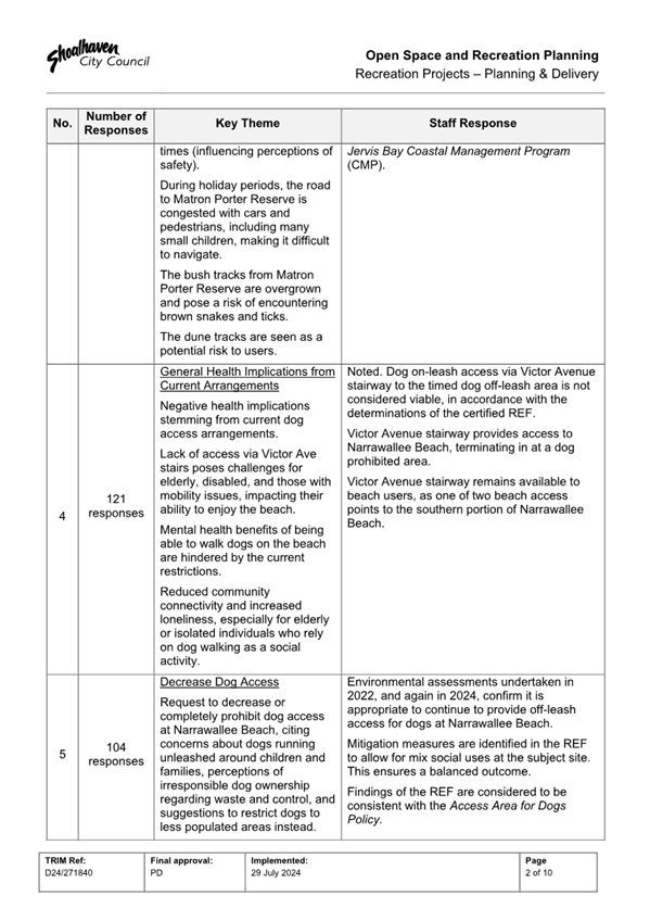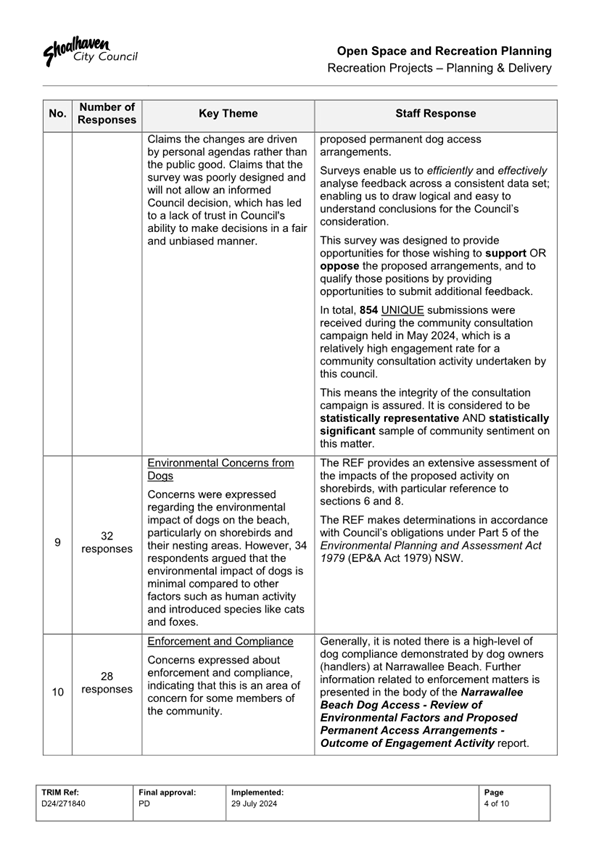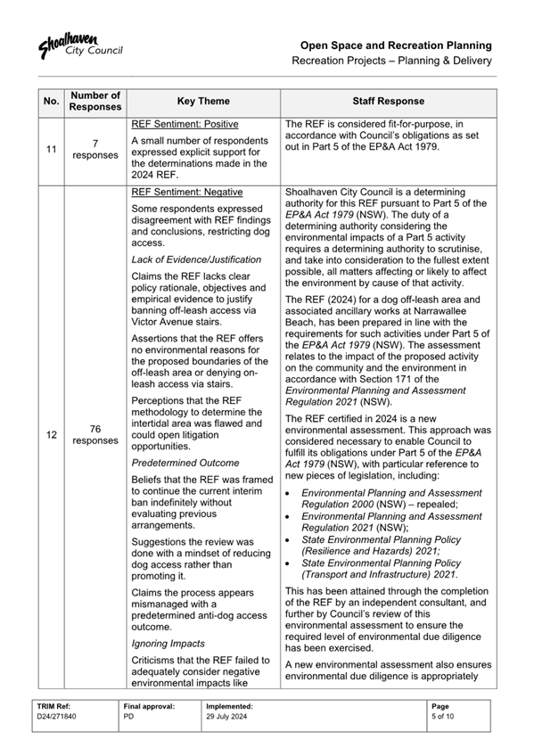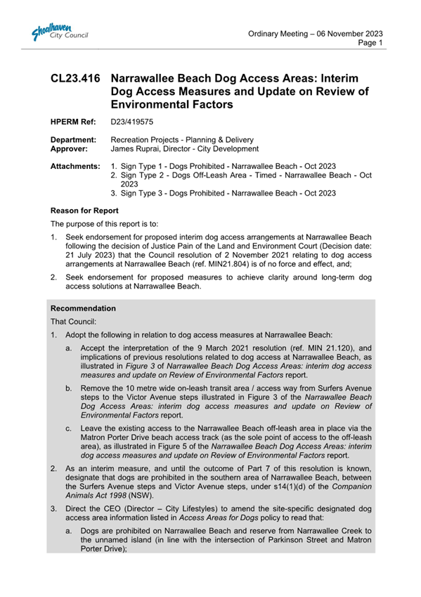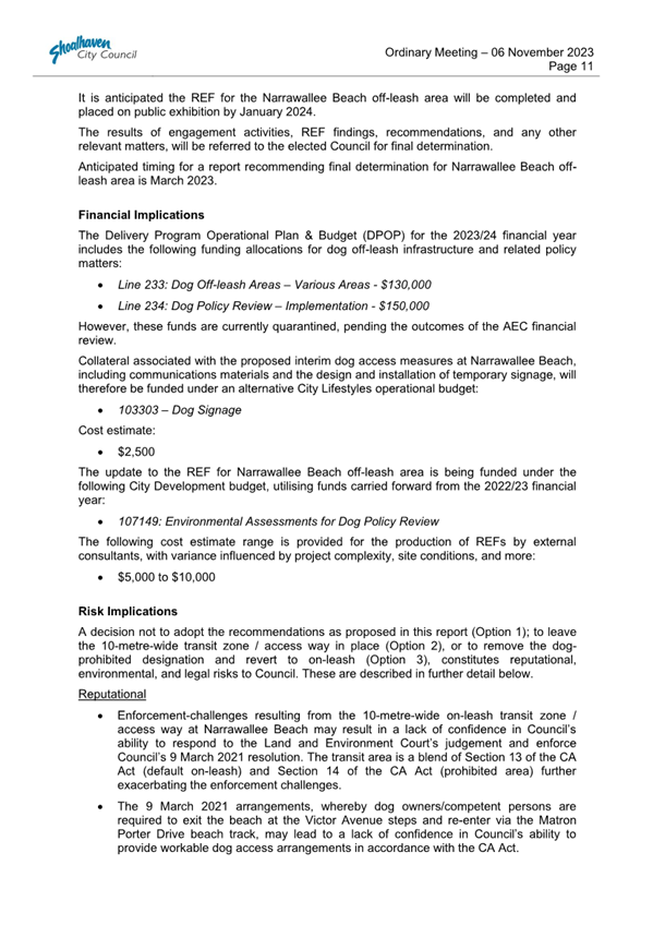 Attachment 1.... Report - Narrawallee Beach Dog Access - Review of Environmental Factors and Proposed Permanent Dog Access Arrangements - Outcome of Engagement Activity (06/11/2023)................. 397