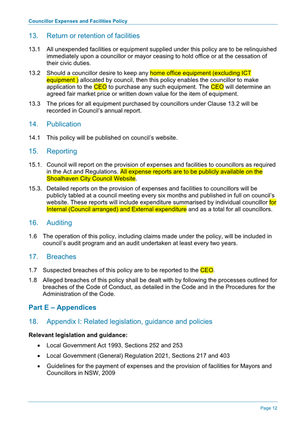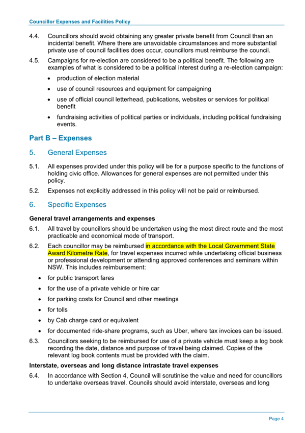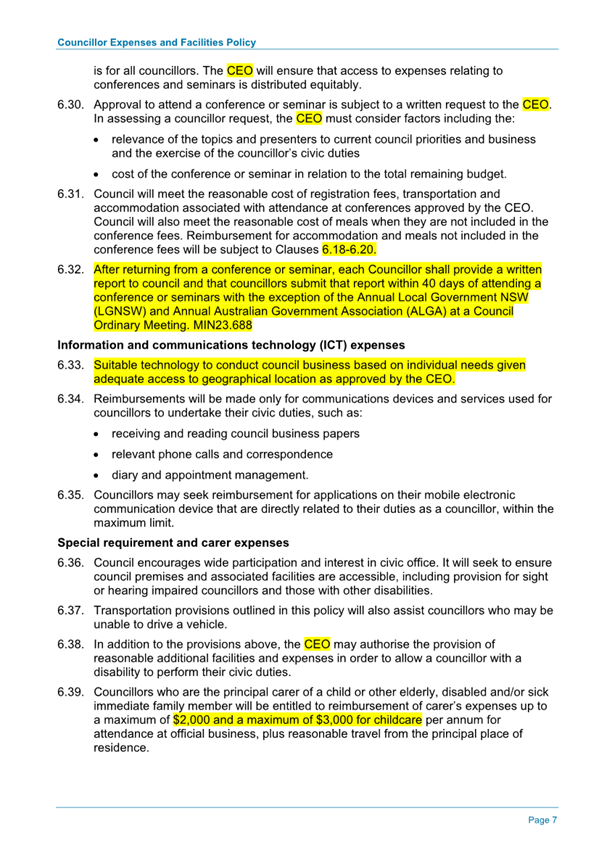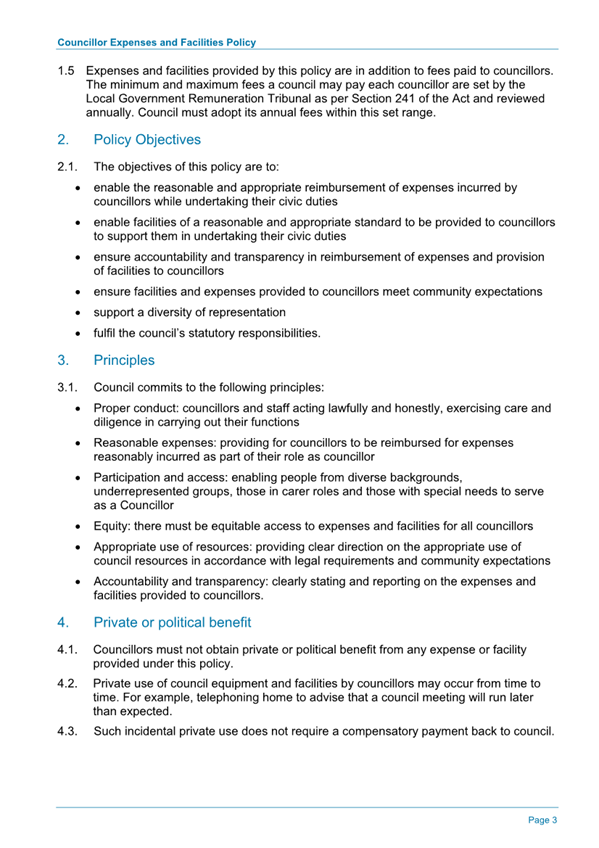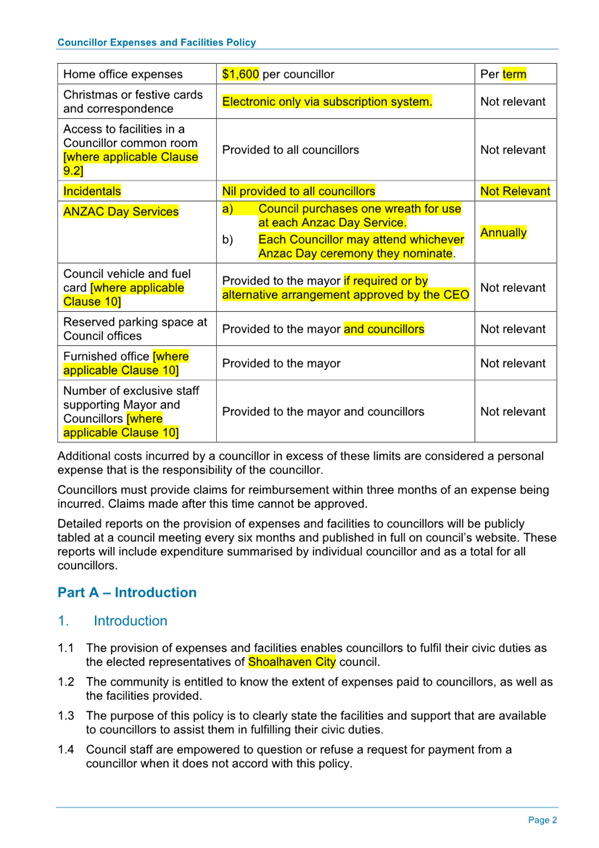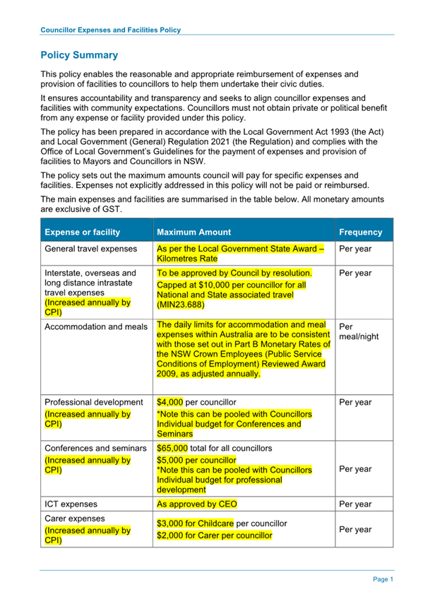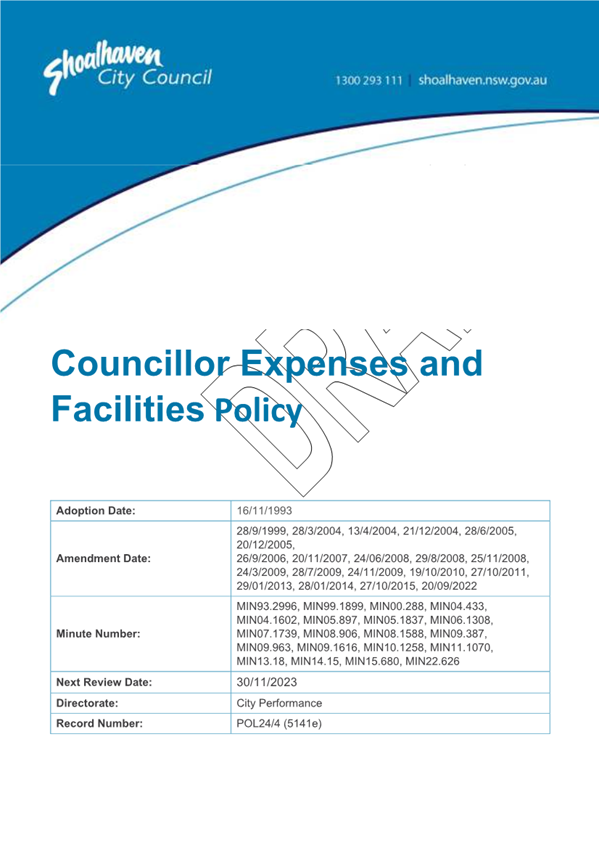 Attachment 1.... DRAFT - Councillor Expenses and Facilities Policy.......... 174