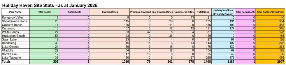 Details relating to Council’s Holiday Haven operations are outlined below for all 12 locations. Please note that Holiday Haven forms part of the City Services portfolio.