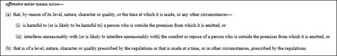 The definitions within the Protection of the Environment Operations Act 1997 define offensive noise as: