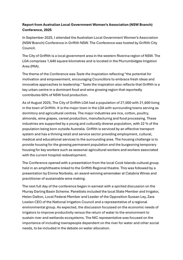 To provide a report (Attachment 1) from Clr Gillian Boyd on the Australian Local Government Womens Association Conference 2025 (ALGWA) held in Griffith NSW, 4-6 September 2025 in accordance with clause 6.32 of Councillor Expenses and Facilities Policy.